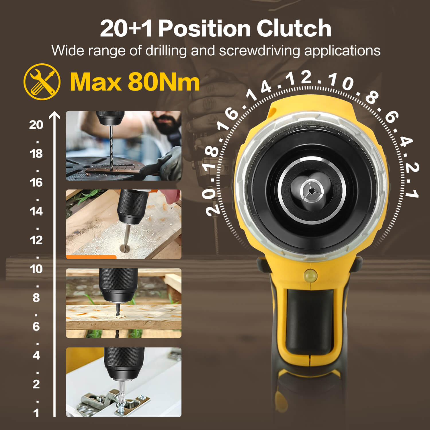 [Unfettered Cordless Work] 20+1 torque settings provide precise control for indoor or outdoor drilling and screwing. Driving in/out screws to prevent stripping;Drilling into wood, ceramics, tiles, drywall, plastics and metal with ease.Friendly to workers at height.