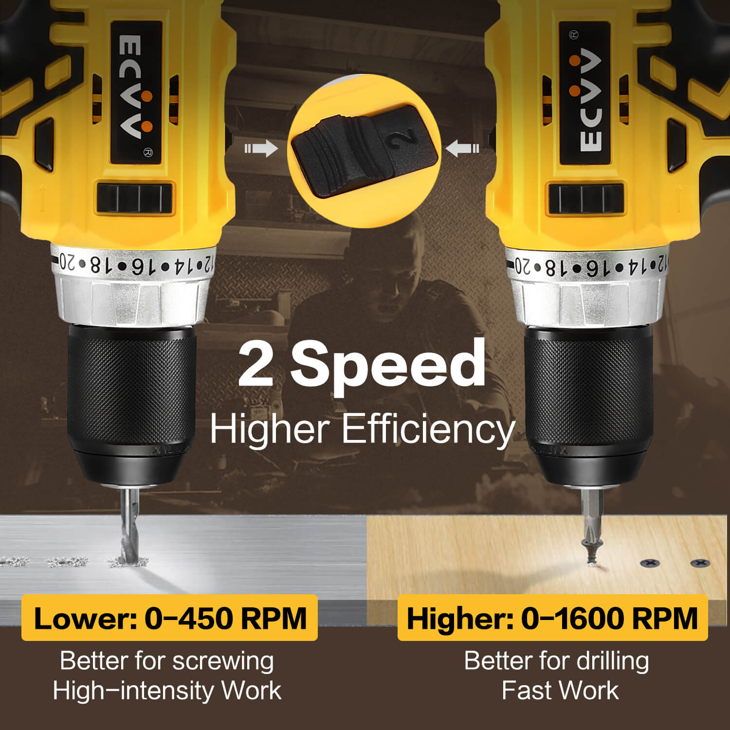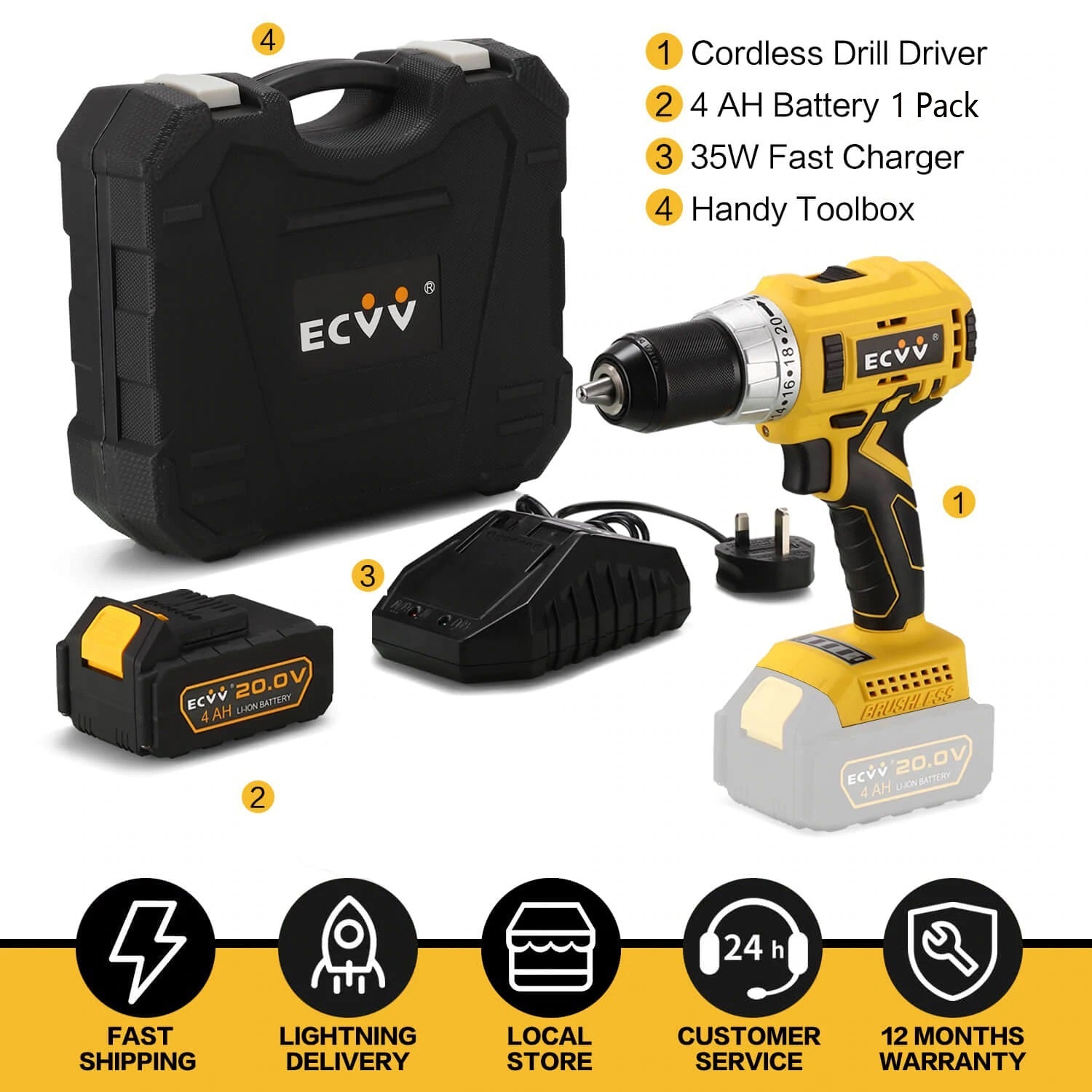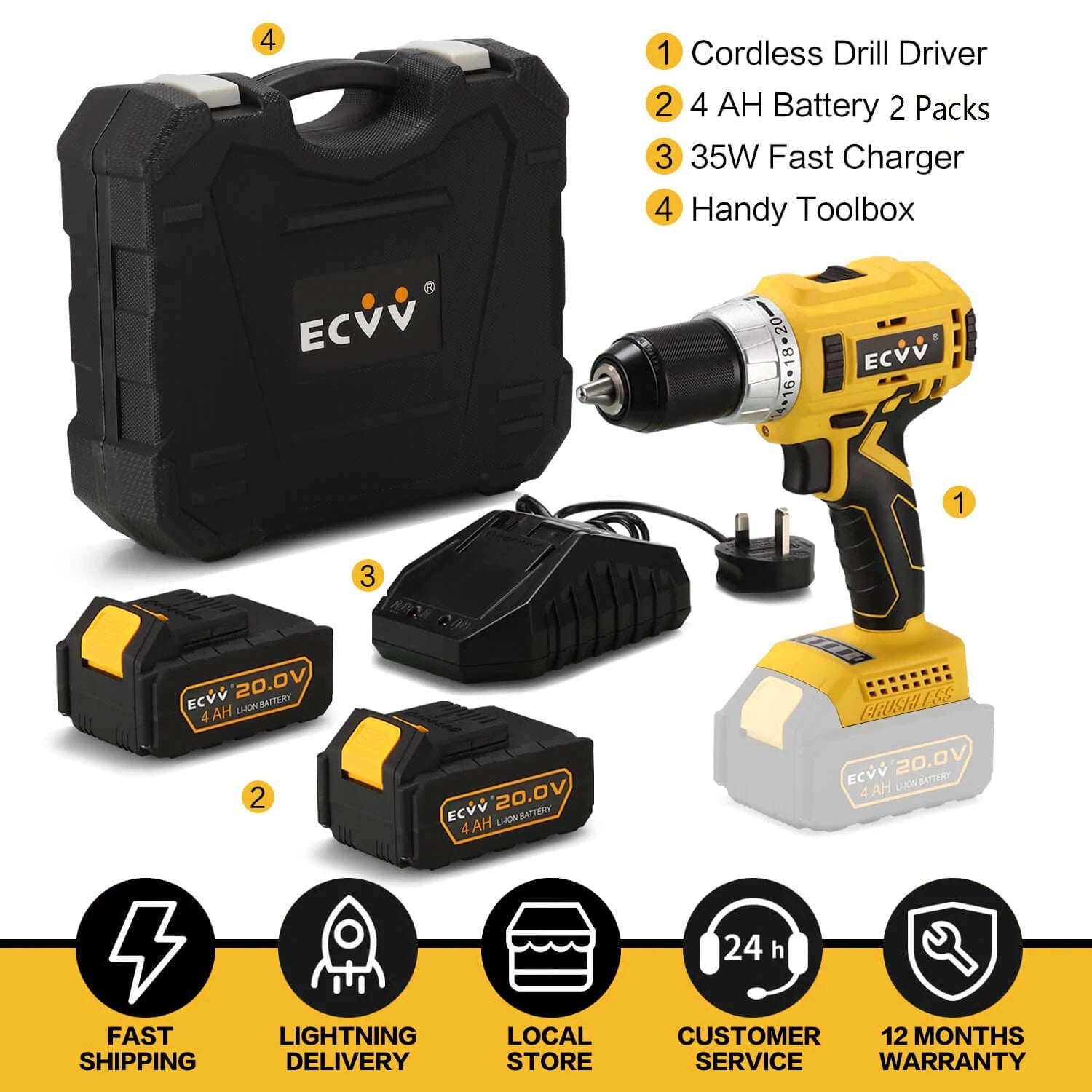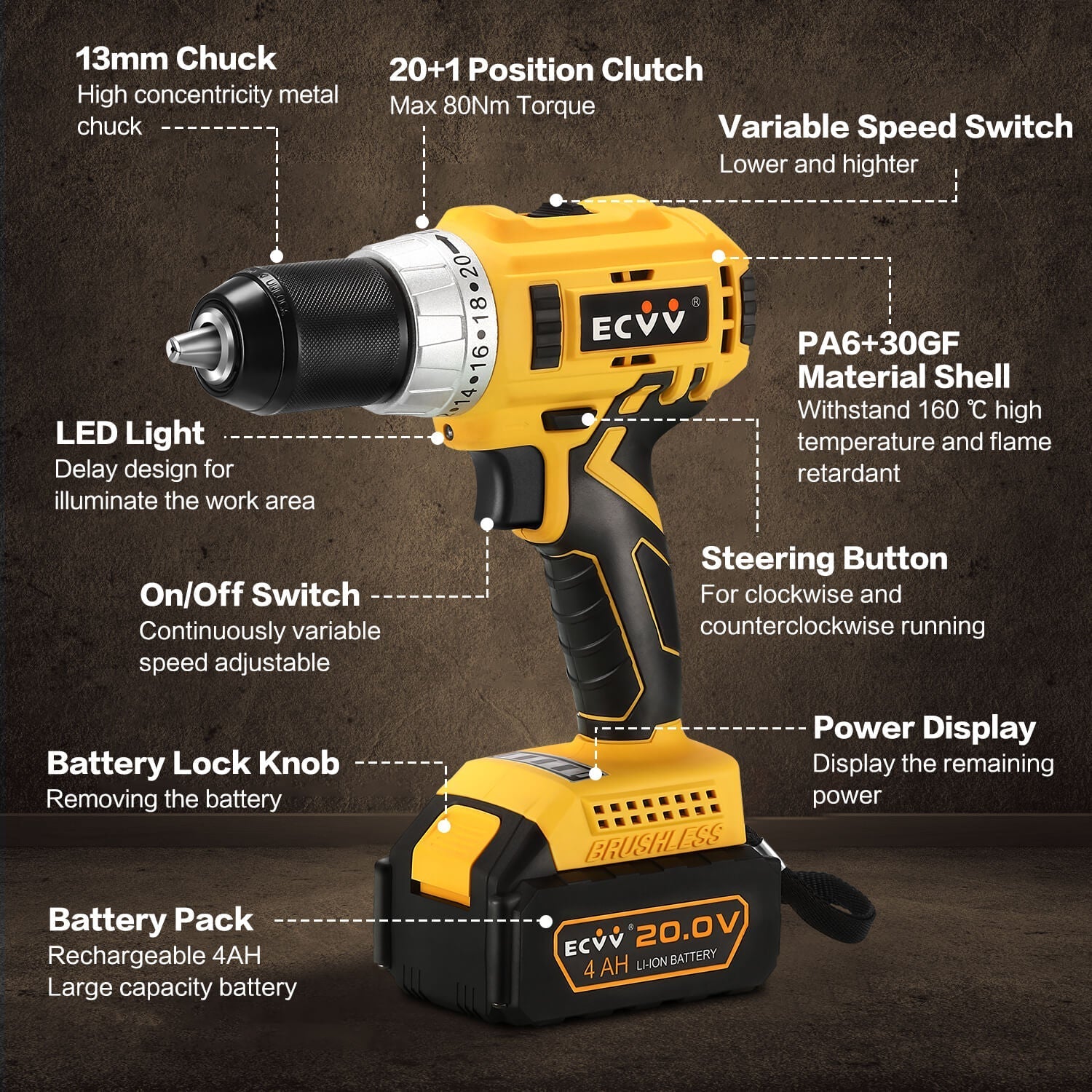 ECVV Cordless Drill Driver Kit 80Nm Torque 20V Brushless Driver 2-Variable Speed with Fast Charger 13mm Metal Chuck for Fastening and Drilling