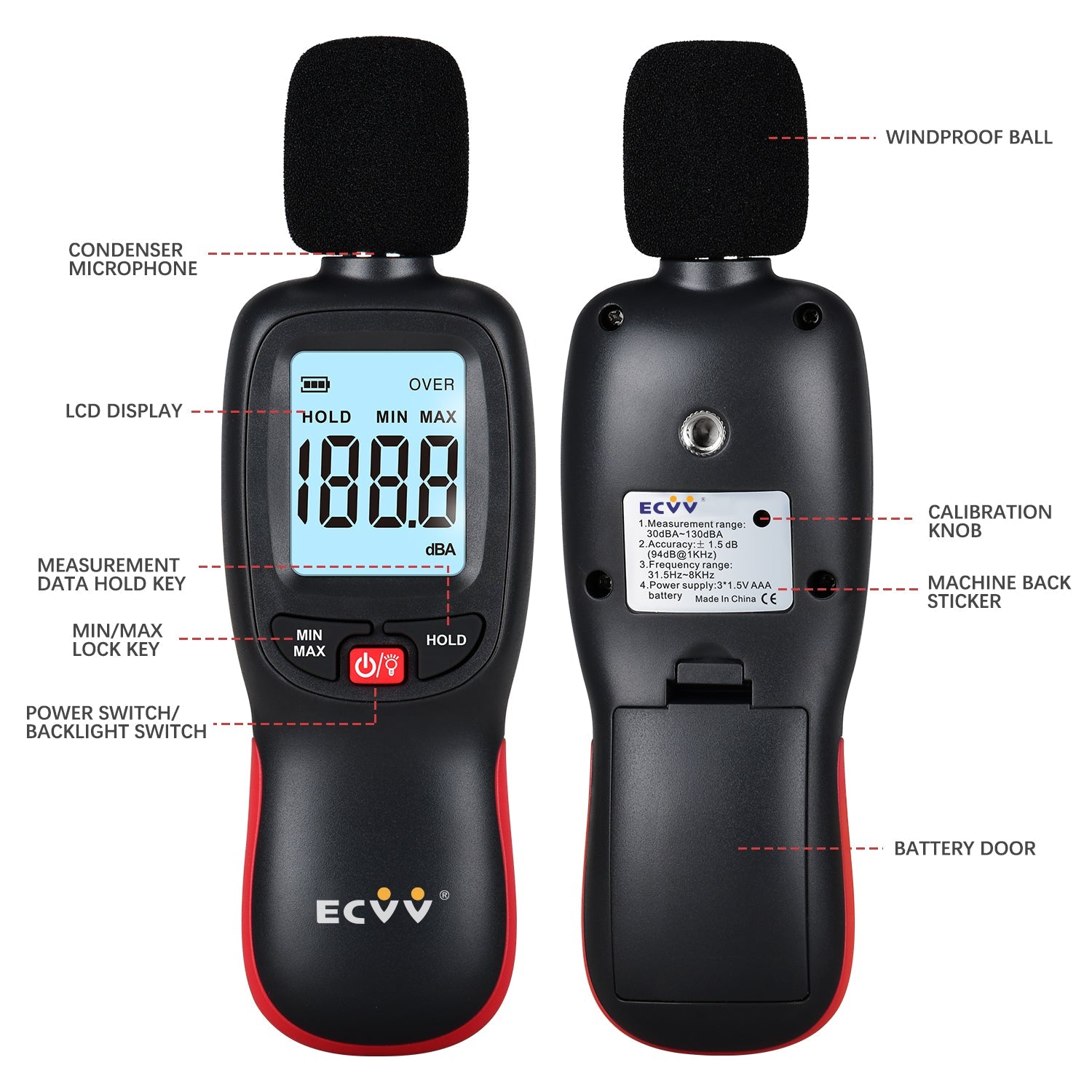 ECVV Sound Level Meter Portable Digital Noise Meter Tester with LCD Backlight Display Decibel Meter with Data Record Function Measuring Range 30~130dBA