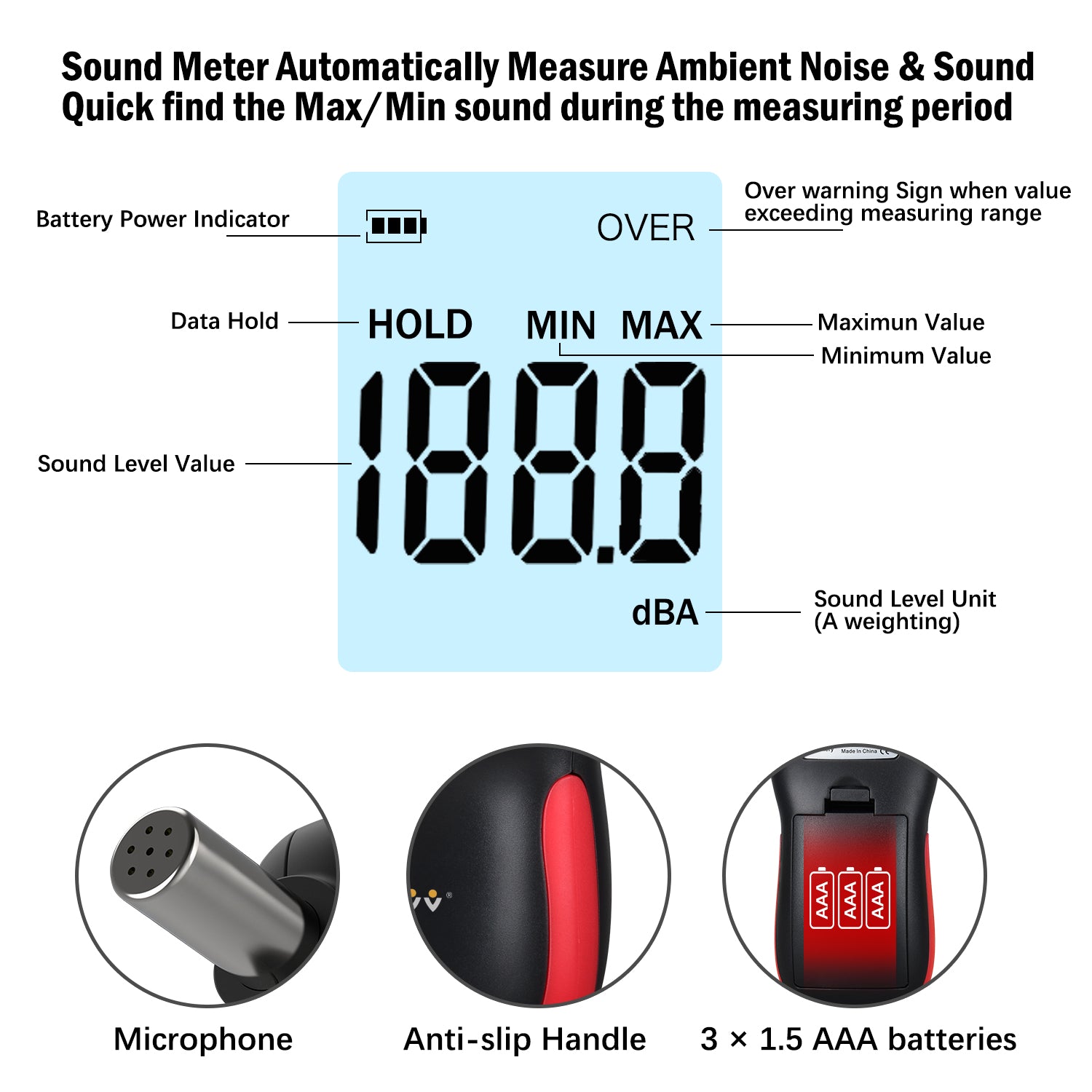 [EASY And Alarm Function] - Super easy and simple to use. All readings are measured in dBA, the most common decibel reading for most all applications, home and commercial. Simply turn on and get a reading! When value exceed the measuring range, there is a backlight flashing prompt.