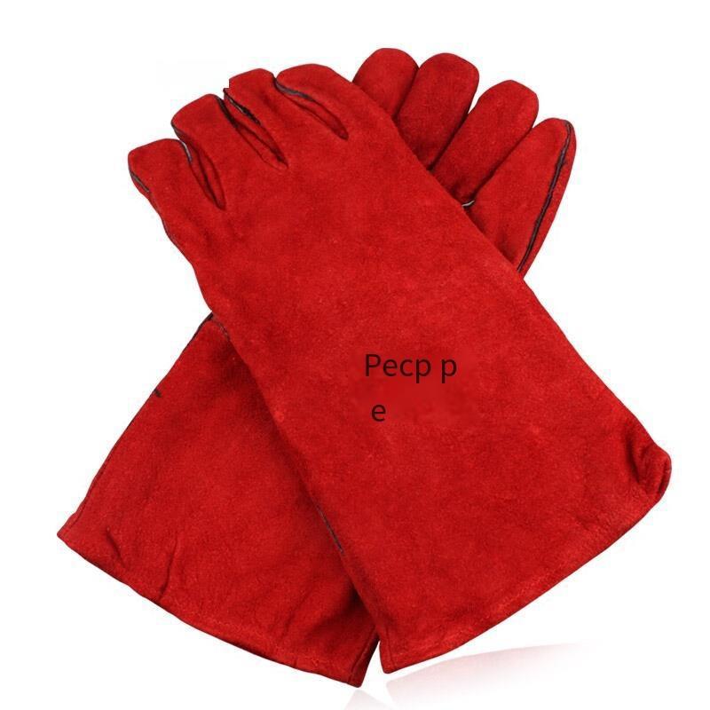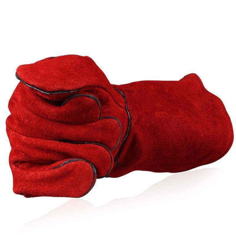 One Pair Electric Welding Gloves Heat Insulation And Wear Resistance Cow Leather Welding High Temperature Resistance Thickening Lengthened Industrial Labor Protection Gloves Red L