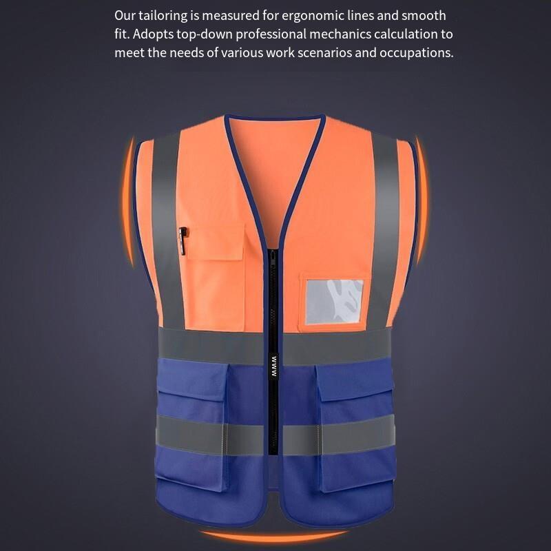 6 Pieces High Visibility Zipper Multi Pocket Reflective Vest Safety Warning Vest 4 Reflective Strips - Fluorescent Orange + Blue