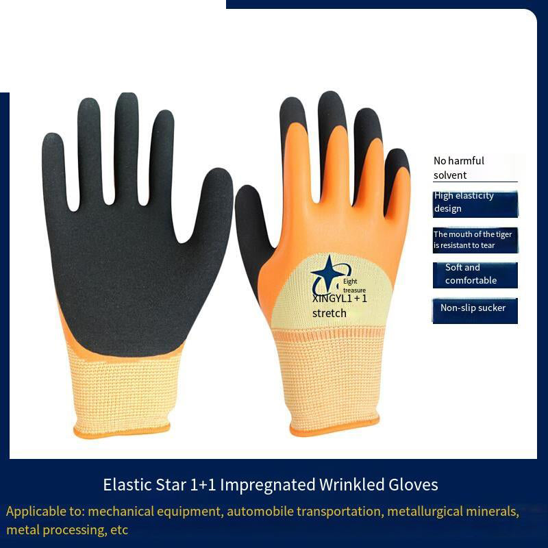 Labor Protection Gloves Dip Rubber Wrinkled Gloves Latex Double-layer Labor Protection Gloves Anti Slip And Wear Resistant Elastic Star (12 Pairs) Size M