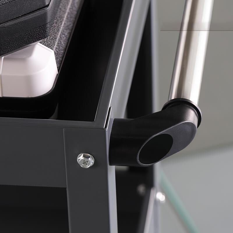 This tool trolley is made of cold rolled steel. With the help of the cold rolled steel, the load capacity of every layer is 66lbs. So, this is a stable tool trolley. The material of the car handle is steel and pp which is anti-rust and preservative. At the same time, the wheel has a high load capacity and is silent.