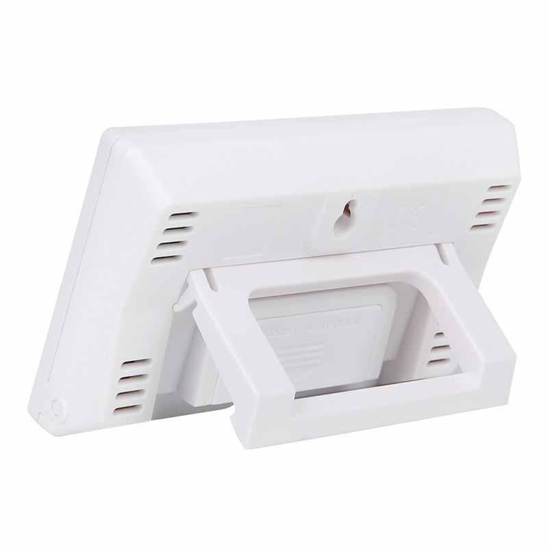 A10T measures real-time temperature and humidity and displays readings on a large screen. These can be used both indoor and outdoor. It has an alarm clock and 12/24 time mode and displays comfort ratings based on the combination of temperature and humidity. The hanging hole and tripod are available for wall or table mount.
