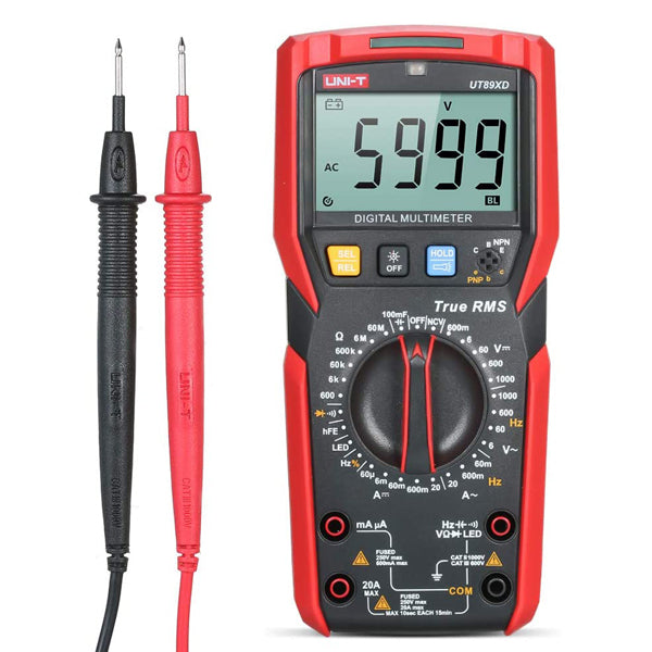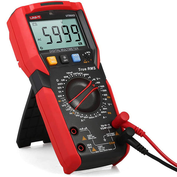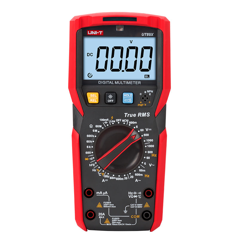 UT89XD is a reliable hand-held 3 5/6 bit digital multimeter with true RMS sine wave measurement. It can measure Max. 1000V DC/AC voltage, Max. 20A DC/AC current, resistance, capacitance, frequency, diode, hFE, continuity and NCV, quickly distinguishing between neutral and live wires accurately. UT89XD can perform LED test. Equipped with audible and visible alarm, flashlight and auto backlight functions, this series can be used in dark environment. It attracts users with its bi-color durable case, modern exterior and multiple functions.